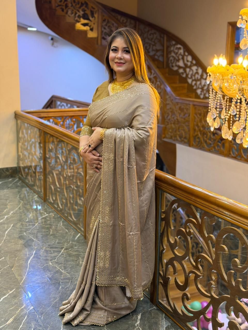 Light Brown Silk Fabric Saree with Zarkan Work